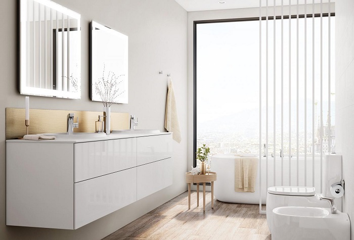 • ✔ Complemented with elegant faucets and LED mirrors.